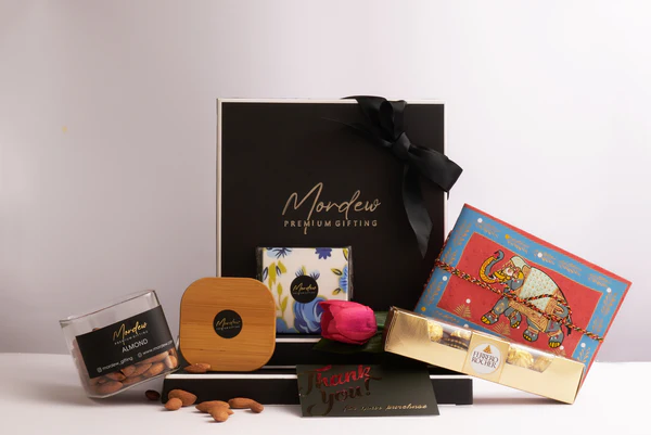 (5) Elegant black gift box – A statement piece in itself, adorned with a satin black ribbon, embodying class and sophistication.