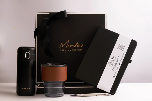 (1) Premium insulated flask (Borosil) – A sleek, black insulated flask designed to keep beverages hot or cold for hours, making it the perfect companion for work and travel.