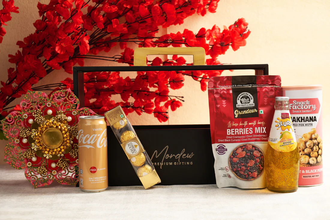 Celebrate joyous moments with the Festive Indulgence Hamper, a perfect blend of luxury, flavor, and festivity. Thoughtfully curated to delight every taste bud, this hamper is an excellent gift for Diwali, corporate celebrations, and special occasions. Encased in an elegant Mordew premium gifting box with a stylish golden handle, it exudes sophistication and festivity.