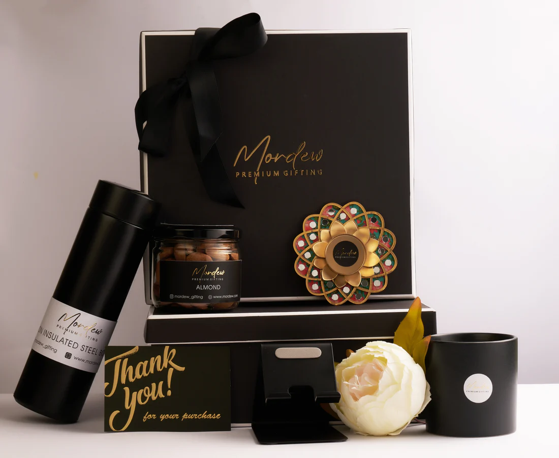 Refined, elegant, and timeless—the Noir Luxe Gift Hamper by Mordew is the epitome of sophistication. Designed for those who appreciate premium quality and aesthetics, this all-black hamper exudes luxury and functionality in every detail. Reusable box size – 12 x 10 x 4 inch.