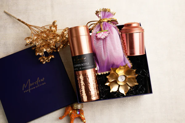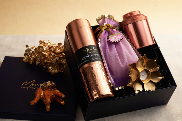 (1) Premium hammered copper bottle – crafted with elegance, this copper bottle not only exudes sophistication but also offers health benefits with its ancient ayurvedic properties.