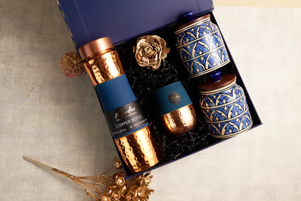(2) One Hammered Copper Bottle – A Premium Copper Water Bottle Wrapped In Deep Blue, Combining Health Benefits With Opulent Design For A Truly Sophisticated Drinking Experience.
